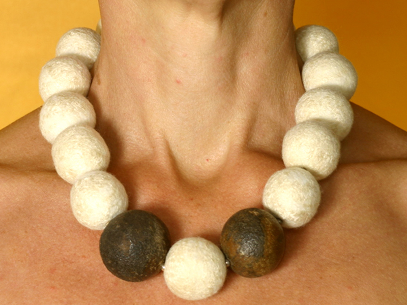 Halssieraad met viltkralen, zilver en zaden.