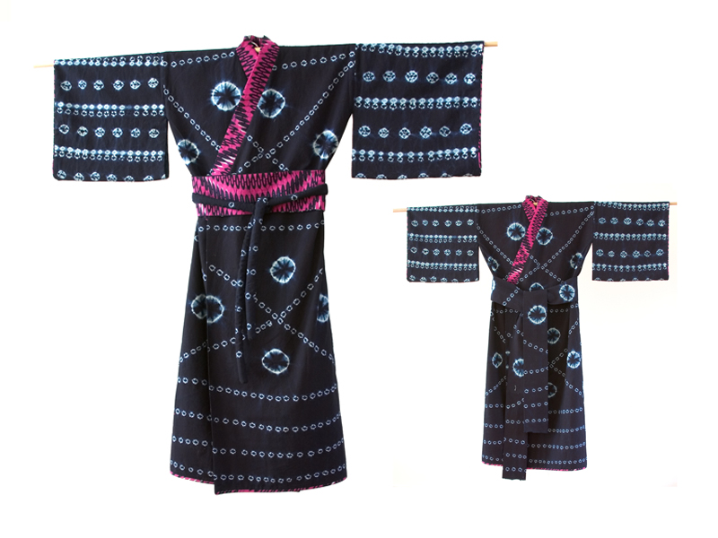 kimono van handbedrukte indigostof, tweezijdig draagbaar en tweezijdige obi.